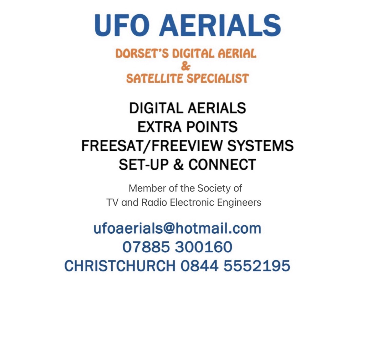 Dorset’s Digital Aerial & Satellite Specialist Member of the society of TV and Radio Electronic Engineers CONTACT ME ON:- 07885 300160 – 0844 5552195 or
